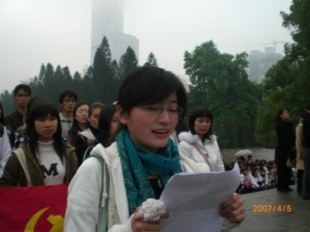 06级全体党员首先来到广州起义纪念碑前举行了庄严的悼念烈士仪式。各位党员怀着无比沉重的心情默哀一分钟,并献上自己亲手做的小白花,表达对先烈深深的缅怀。支部宣传委员廖爱芬同学代表全体党员发言,她号召全体党员要牢记烈士的遗愿,用自己的实际行动呼唤文明进步的春风,用聪明才智创造共和国无限美好的明天。