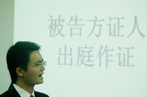 本次模拟法庭另一大亮点是参与庭审人员的专业性。威严的审判长、精明细致的律师,审判长的每一句话,律师的每一次陈词,证人的每一次答辩,都使旁听人感受到逼真的庭审气氛。满口乡音的农村妇女证人、家财万贯的梁百万等,又不乏幽默的证言证词,为庭审增添了不少观赏性。