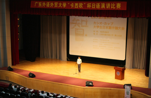 本网讯 10月26日下午,2007年广东外语外贸大学“卡西欧杯”大学生日语演讲比赛在云山会堂拉开帷幕。卡西欧(上海)贸易有限公司副总经理吉田修作,东语学院副院长陈多友、党总支副书记敖湘晖等出席了本次大赛。