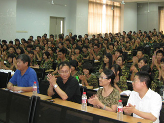 在F207、208两间大课室里,身穿军服的新生们精神抖擞、坐姿挺拔。当领导们走进课室时,课室里马上响起雷鸣般的掌声。