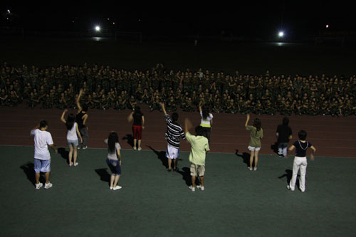 其中最大的亮点还属可爱的教官们,原本是观众席中“安分”的观众,却都难逃表演的“厄运”,一个个接连被拉上“舞台”,有弹奏乐器的,也有唱歌的。每一个教官表演时,能听到同学们震耳欲聋的欢呼声;表演结束后,疯狂的“粉丝们”拿着从操场草丛中拔出的“鲜花”激动地献给他们的“偶像”,微弱的灯光下依稀可见教官们幸福而灿烂的笑容。