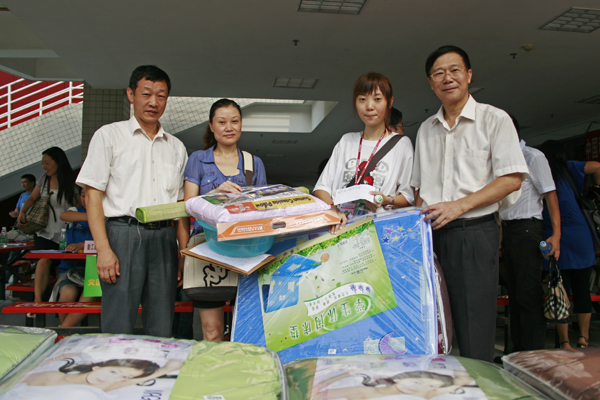 上午九点,我校在南校区勤工助学中心新生接待处举行了困难学生捐赠慰问仪式。陈建平和许国彬向灾区学生代表捐赠了由又康超市提供的生活用品,并向其表示了亲切慰问。植秀聪、詹文都,后勤处副处长杨思等参加了捐赠慰问仪式。