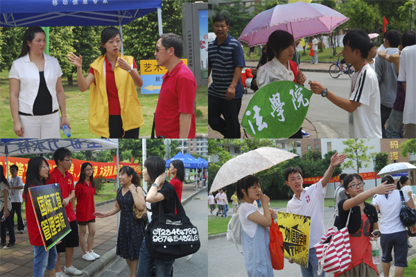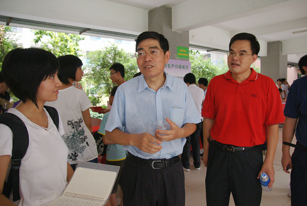 9月6日早上,校党委书记徐真华,党委副书记陈建平、许国彬,副校长董小麟、顾也力,学生处处长植秀聪,教务处处长詹文都到南校区各个学院的新生报到处进行了巡视。领导们跟各个学院的老师深入交流,了解新生报到情况和接待工作进展情况。徐真华赞扬志愿者的工作,他说,高年级的同学以满腔的热情迎接新生,以好的风气引导新同学过渡到大学生活,进行自主学习。谈到学习与专业,徐真华说:“广外没有不好的专业,只有不努力学习的学生!”陈建平和董小麟均表示,今年迎新的接待程序渐趋完善,联络点多,新生到校之后不用长时的排队等候,便捷了许多。