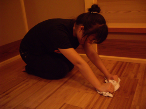 等一切“尘埃落定”以后,大家便开始擦拭地板,老师介绍说:“日本茶室打扫不像中国家庭一样,马马虎虎用吸尘器洗一洗,或者拿拖把拖一拖就可以完事,它需要一丝不苟地讲地板每个角落都打扫干净,并且为了防潮,需要第一次用湿布,第二次用干布进行。由于需要用布逐一擦拭,打扫者不得不跪在地板上,一次打扫下来大多人都会腰酸背痛膝盖疼。”