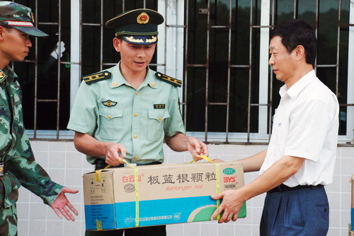 本网讯 9月17日下午,白云山和记黄埔中药有限公司为广外南北校军训场上顶着酷日训练的教官和新生们送来120箱清热解毒的口炎清颗粒和板蓝根。我校党委副书记许国彬、保卫处处长钟罗军和学生处处长植秀聪出席了赠送仪式,并且在现场亲自把凉茶转交到几位教官和学生代表的手上。受我校党委书记徐真华和校长隋广军的委托,许国彬代表学校对参加军训的所有教官和同学进行了亲切的慰问。