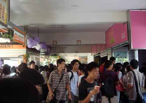 整个架空层熙熙攘攘,但云山工作室玻璃门上挂出谜语的竞猜游戏,引得同学们一个个睁大眼睛盯着谜语竞相思考,挑战自己的反应能力。凉茶坊也准备了游戏环节,摊位前排起了长长的队伍。答中所抽题目问题的同学就可以进行抽奖,奖品包括雪糕、会员卡、凉茶等。云山健身房也设置了健康知识有奖竞猜环节,并且在健身房还举行了器械区和大众班的免费体验活动。其他实体也推出了自己的促销活动。
