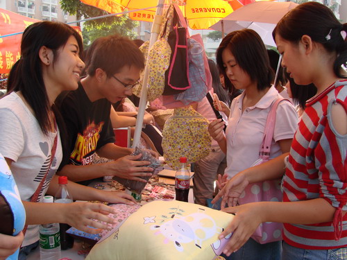 工作人员说,到下午3点半,他们已经是第二次进货了,还有很多产品已经脱销,很多同学不得不采用订货的方式,预计下星期才能送到同学们手中。记者采访了一位购买抱枕的梁同学,她说这些手工制品不仅制作精良而且价格合理,举行这样的活动很有意义。
