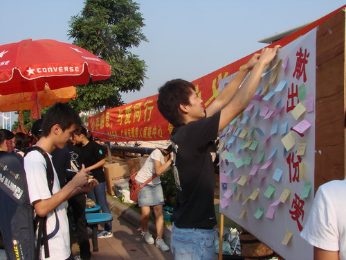 展台的旁边是爱心留言栏,上面贴满了广外学子对智障人士的鼓励的纸条。“人生不因残疾而缺少希望,反而因此而发现爱!”“天生我才必有用,活出自己的精彩!”“祝你们开心快乐每一天!”缕缕温情弥漫校园。