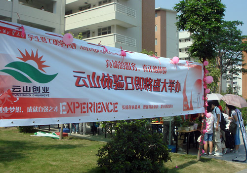 勤工助学中心专门设置了一个摊位,播放宣传云山创业园的视频,其中包括徐真华校长对创业园的寄语、勤工员工的感言以及以往的活动介绍等。学生创业促进会在入口处设置摊位,提供“如何进入创业园”的咨询,简单的流程如下:提交申请材料→项目评审→创业园审批→签订协议→办理手续→入驻创业园。