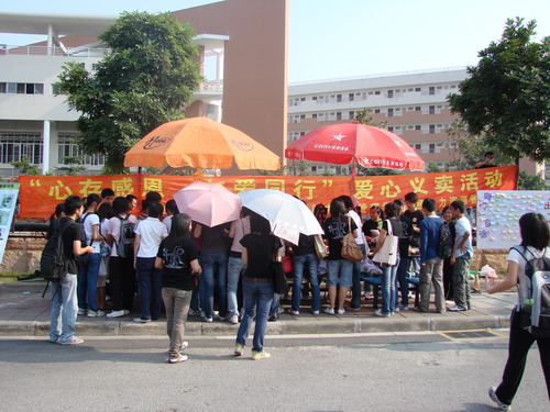 本网讯 10月25号上午,由广州市残疾人展能中心、国际工商管理学院06级人力资源1班主办的“心存感激,与爱同行,爱心义卖活动”在文采园对面的校道上展开。