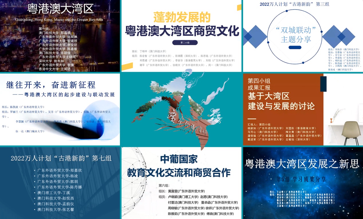 研修班将学员分为8个小组,期间开展多次组内研讨,就某个专题或整体所学积极准备小组展示材料,15日下午各小组的展示精彩纷呈,既有概况性的梳理,又有专题性的感悟,充分展现了新时代湾区大学生的风采。广东外语外贸大学潘依瑜同学对此印象深刻,“研修班还设置了分组作业环节,特地将广东与港澳地区不同大学的同学分配到一起,促进交流沟通与大湾区文化传播,充分发挥了学生们的能动性,使我们积极主动地学习研讨。”