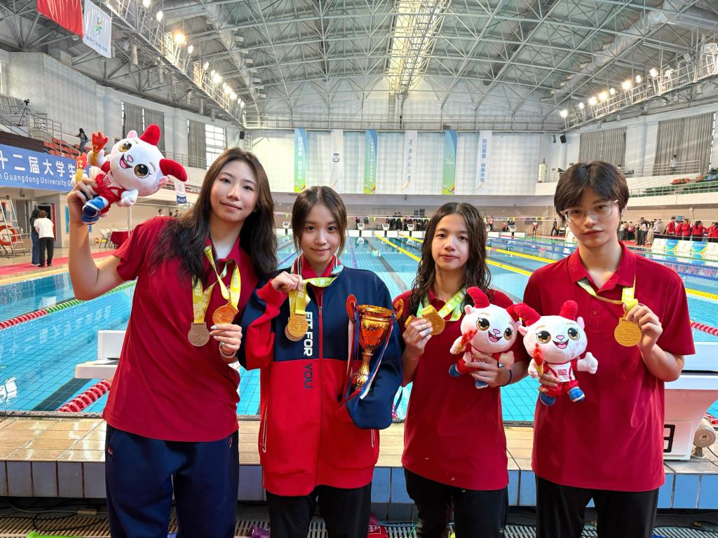这是本届大运会女子甲组4×50米混合泳接力决赛现场,由谭炜君、陈佳楠、欧泳诗、高樱睿组成的广东外语外贸大学代表队,以绝对优势摘得桂冠,助力广外实现该项目的卫冕,并刷新赛会纪录超5秒。